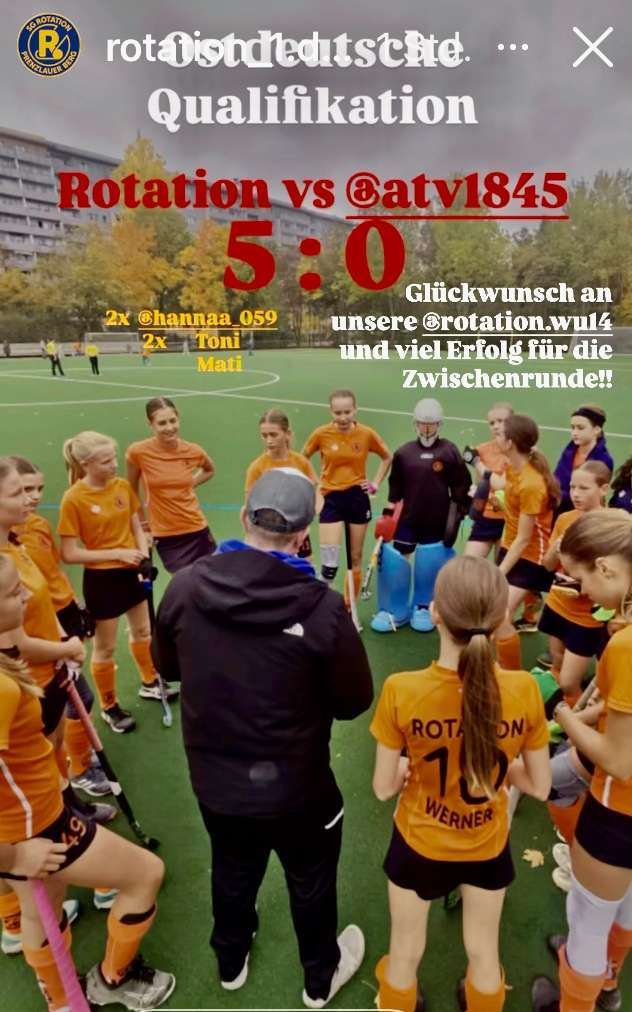 Unsere wU14 gewann heute das Spiel um die Ostdeutsche Vizemeisterschaft souverän gegen den ATV Leipzig mit 5:0 und hat sich damit für die Zwischenrunde zur Deutschen Meisterschaft qualifiziert. Unser Team ging n der 3. Minute durch ein Tor von Hanna Ludwig mit 1:0 in Führung und nach Ende des ersten Viertels stand es bereits 3:0 gegen die Gäste aus Leipzig. Hier unsere Torschützinnen aus dem Live-Ticker: