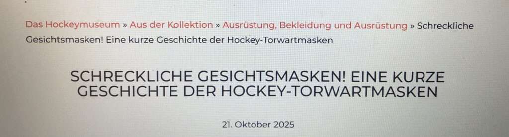 Das Hockeymuseum hat anlässlich von Halloween in der jüngsten Ausgabe seines Newsletters über die Geschichte der furchterregenden Torwartmasken der 1960er und 1970er Jahre geschrieben und dabei auf Beiträge in der Rubrik „Zeitreise“ in unserer Homepage zurückgegriffen. Es freut mich, dass diese Rubrik und damit auch unsere Homepage einen solchen Bekanntheitsgrad hat. Hier Auszüge aus dem Beitrag des Hockeymuseums: